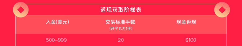 本次活动仅限于外汇及贵金属的标准手数- 现金返现的获取需同时完成相对应的入金和交易手数。