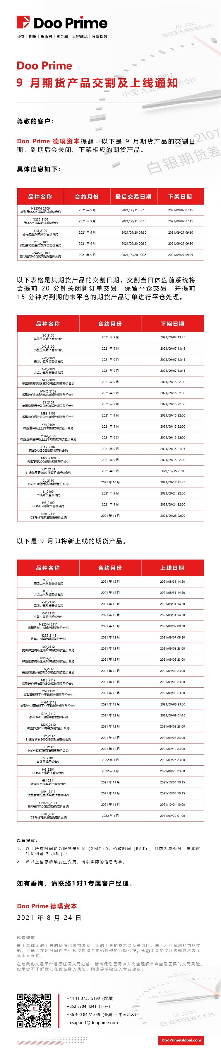 Doo Prime 2021 年 9 月期货产品交割及上线通知