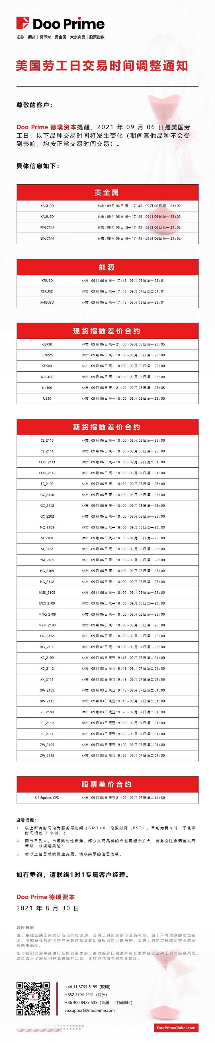 Doo Prime 2021年美国劳工日交易时间调整通知