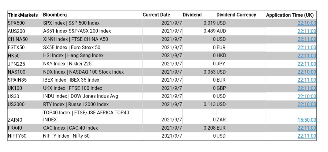 ThinkMarkets 9月7日股指股息结算明细