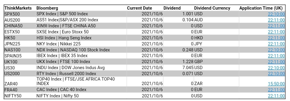 ThinkMarkets智汇平台CFD股指10月6日股息结算明细