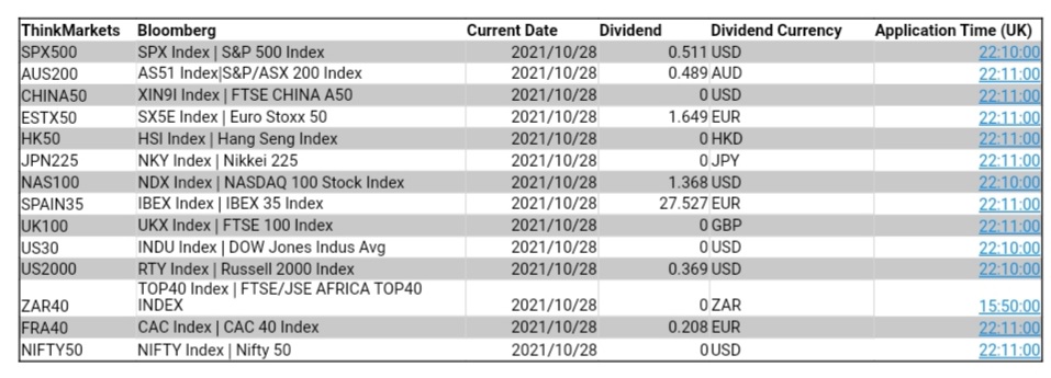 ThinkMarkets 10月28日股指股息结算明细