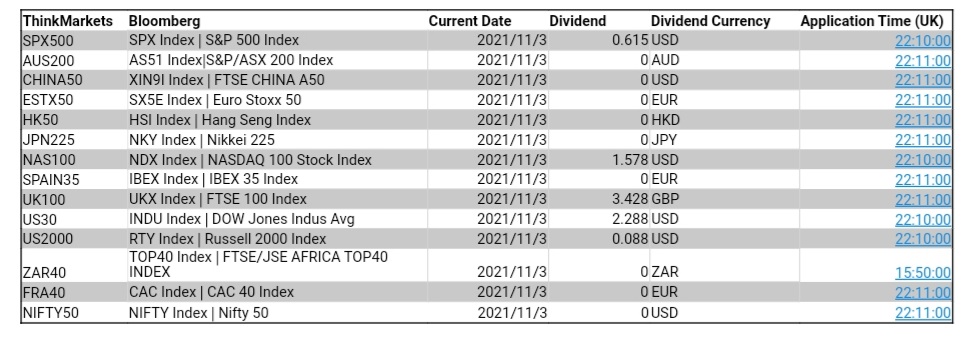ThinkMarkets 11月3日股指股息结算明细