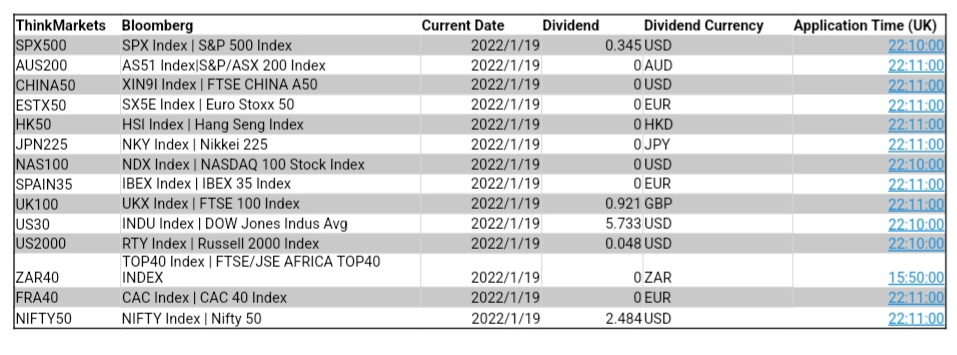 ThinkMarkets 1月19日股指股息结算明细