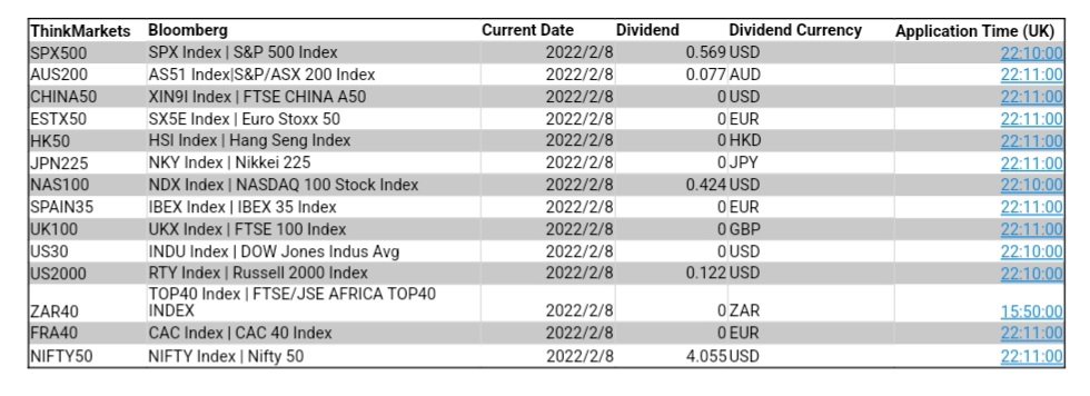ThinkMarkets智汇部分股指结算股息,持多单仓位将会得到利息,持空单仓位将会扣取利息,具体如下表格显示: