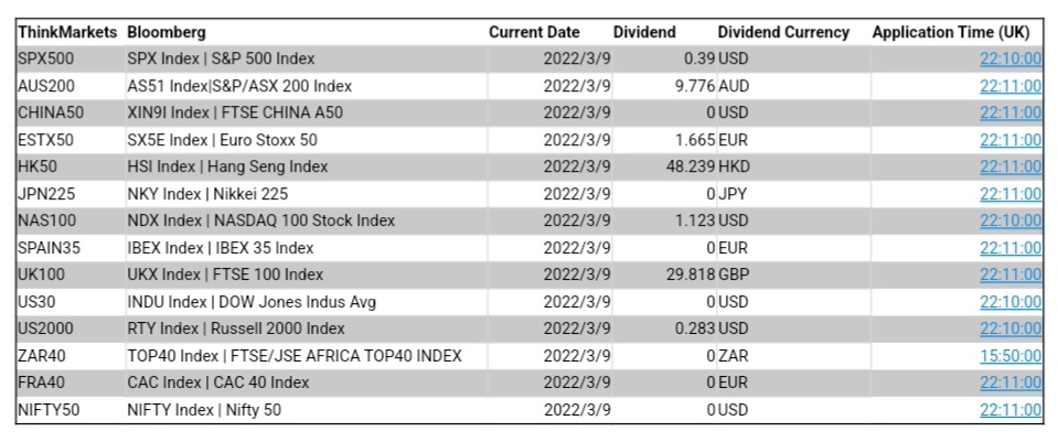 ThinkMarkets智汇部分股指结算股息,持多单仓位将会得到利息,持空单仓位将会扣取利息,具体如下表格显示:
