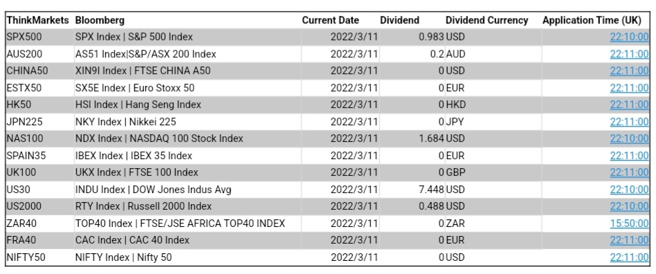 ThinkMarkets智汇平台CFD股指3月11日股息结算明细