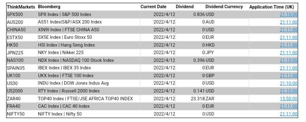 ThinkMarkets智汇平台CFD股指4月12日股息结算明细