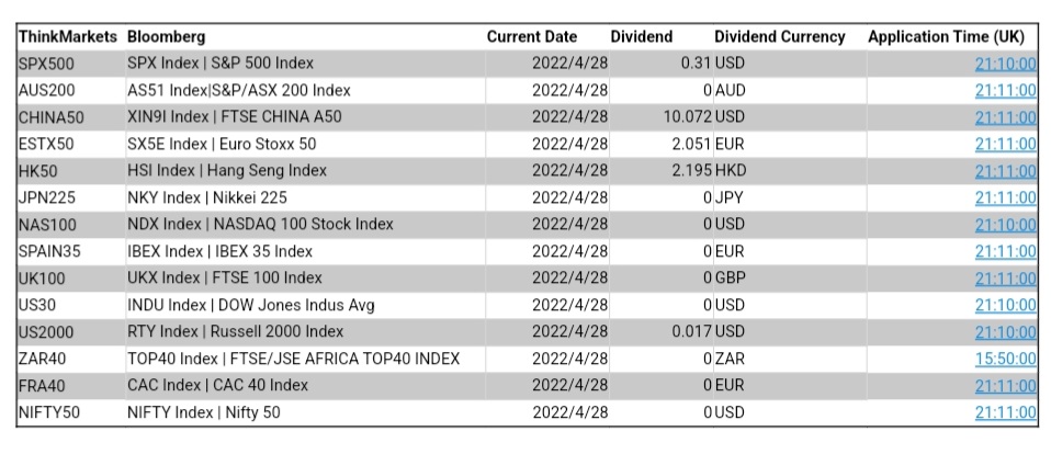 ThinkMarkets 4月28日股指股息结算明细
