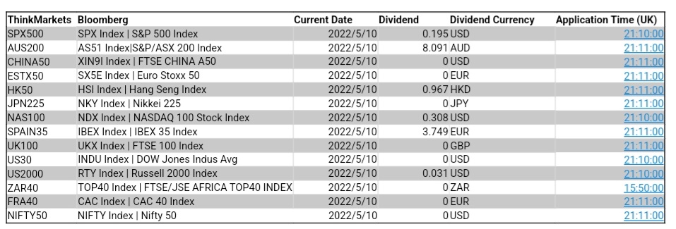 ThinkMarkets智汇平台CFD股指5月10日股息结算明细