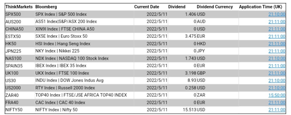 ThinkMarkets智汇平台CFD股指5月11日股息结算明细