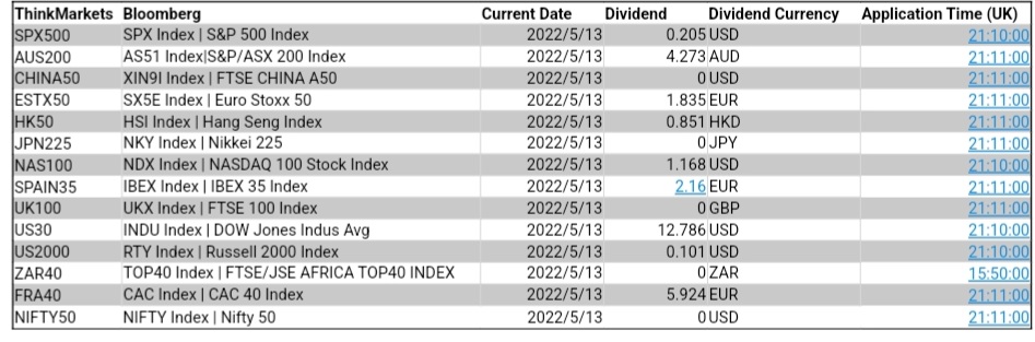 ThinkMarkets智汇平台CFD股指5月13日股息结算明细