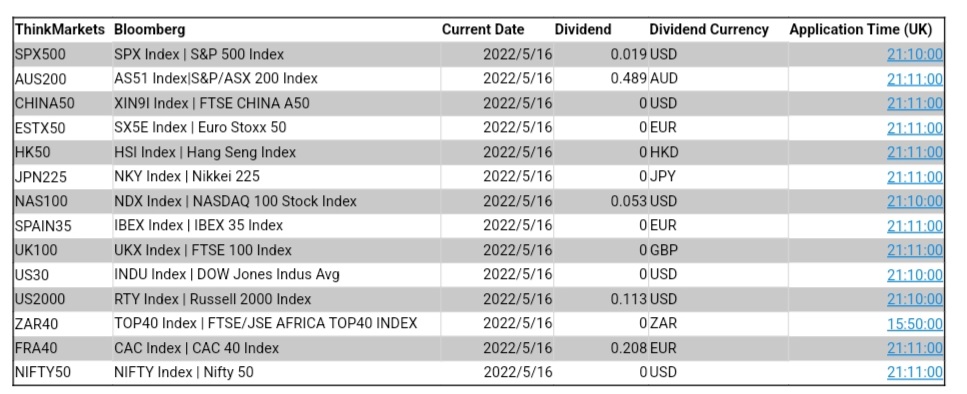 ThinkMarkets智汇平台CFD股指5月16日股息结算明细