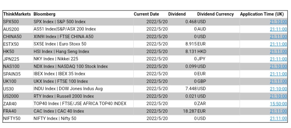 ThinkMarkets智汇平台CFD股指5月20日股息结算明细