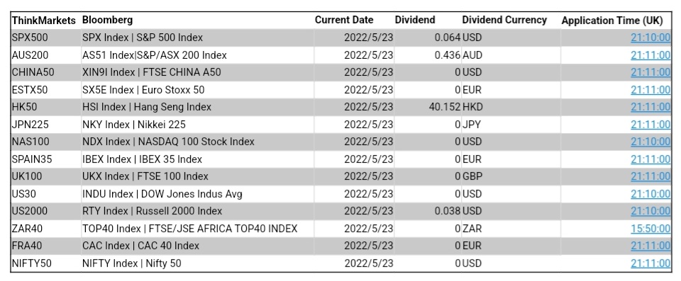 ThinkMarkets智汇平台CFD股指5月23日股息结算明细