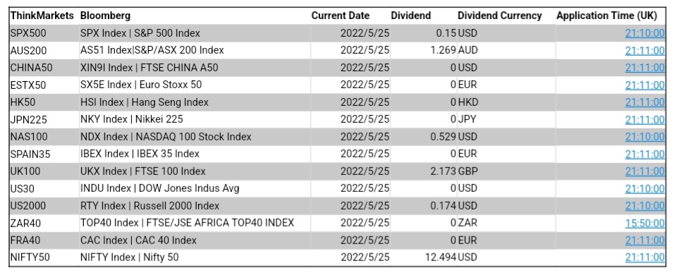 ThinkMarkets智汇平台CFD股指5月25日股息结算明细