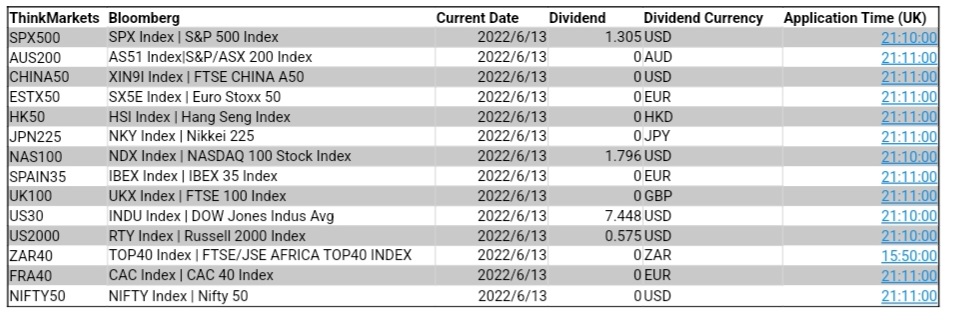 ThinkMarkets智汇平台CFD股指6月13股息结算明细