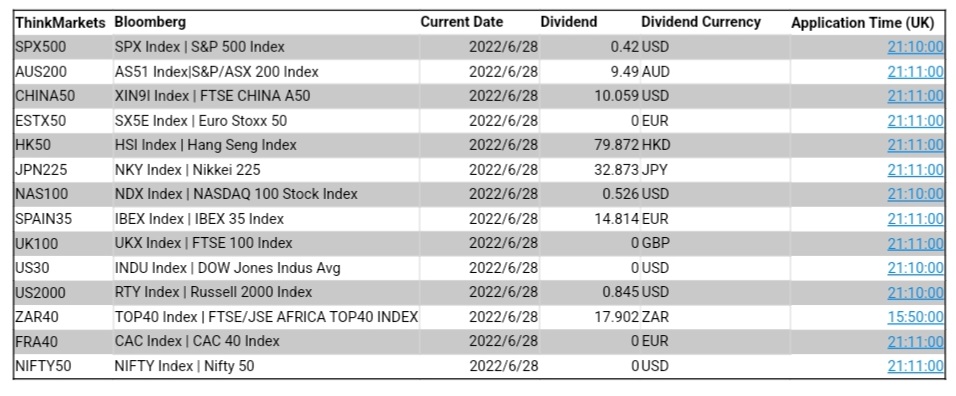 ThinkMarkets智汇平台CFD股指6月28日股息结算明细