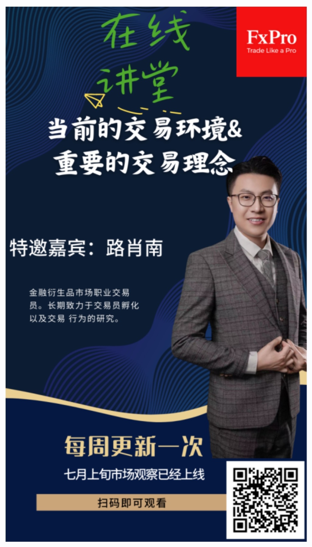 FxPro特邀嘉宾路肖南录播的七月上旬市场观察将分两期播放,本期为第一期,从美联储的这个利率政策以及它的鹰派和鸽派的这些言论来谈大的交易环境以及重要的交易理念。。扫码即可观看。
