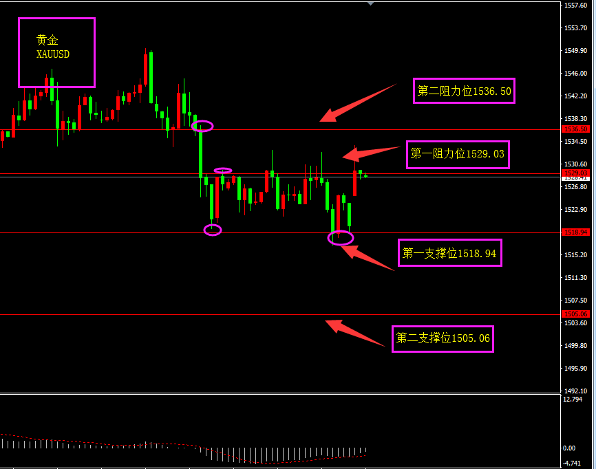 趋势分析:美指以大阳线突破大阴线开盘价,对黄金有所打压。但黄金避险属性的滋生促使黄金上涨。
